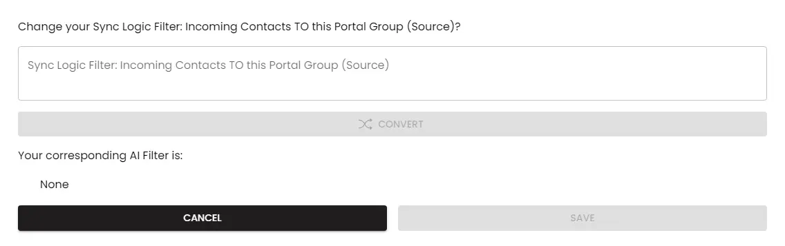 To configure your Portals integration, navigate to the configurations page and select an object type. On the right drawer, select the "Sync Logic Filter" button corresponding to the direction you want to filter records, either "To this group" or "From this group".