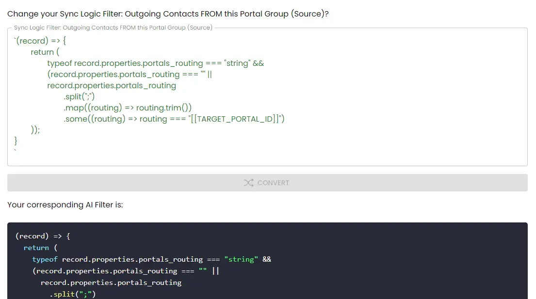 (record) => { return ( record.properties.lead_status === "YOUR_LEAD_STATUS_HERE" && typeof record.properties.region === "string" && record.properties.region !== "" && record.properties.region .split(";") .map((region) => region.trim()) .some((region) => region === "[[TARGET_PORTAL_ID]]") );};Does this work with both custom code written and the plain language AI tool?