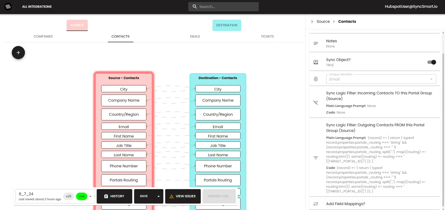 Using these magic values, you can route records to particular HubSpot portals in your integration by creating a custom code filter that looks like this: