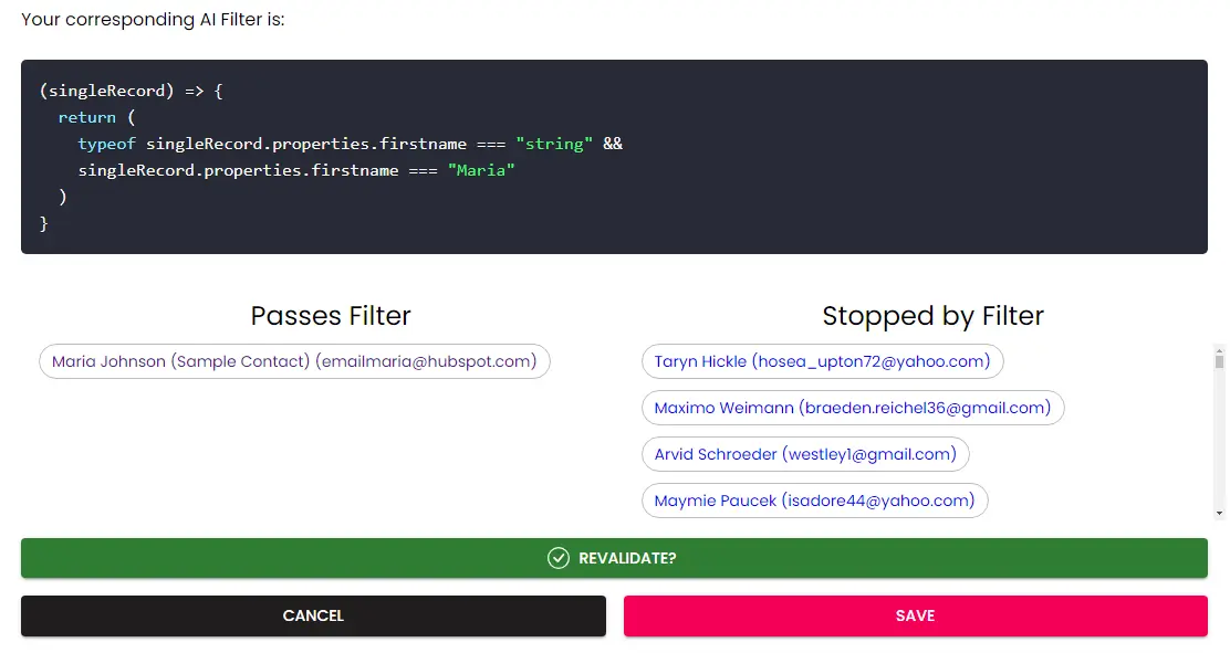 Filters can be written in plain english from which our AI will generate the necessary code after clicking the "Convert" button. You can also write your own custom filter code. Clicking the "Validate" button will search your HubSpot account for records that pass and fail the filter so you can be sure the filter is working as expected.